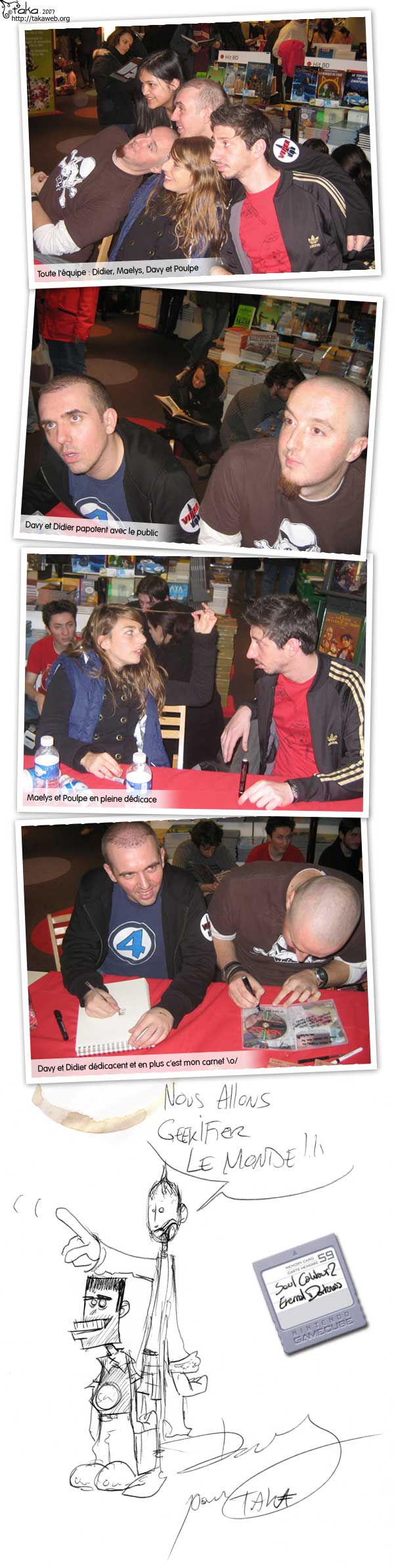 Nous ne sommes pas arrivé au début et d’aprés ce que j’ai compris ce n’est pas plus mal, il y avait de la queue. Mais pas pour nous =) il y avait un petit attroupement mais du coup on a pu discuté. J’ai fait connaissance avec l’équipe et ils sont franchement simpa \o/ Bon, on a pas eu la BD de Davy et Didier mais je m’en fous un peu, ça aurait été cool mais bon, j’étais déjà bien content de les avoir rencontrés